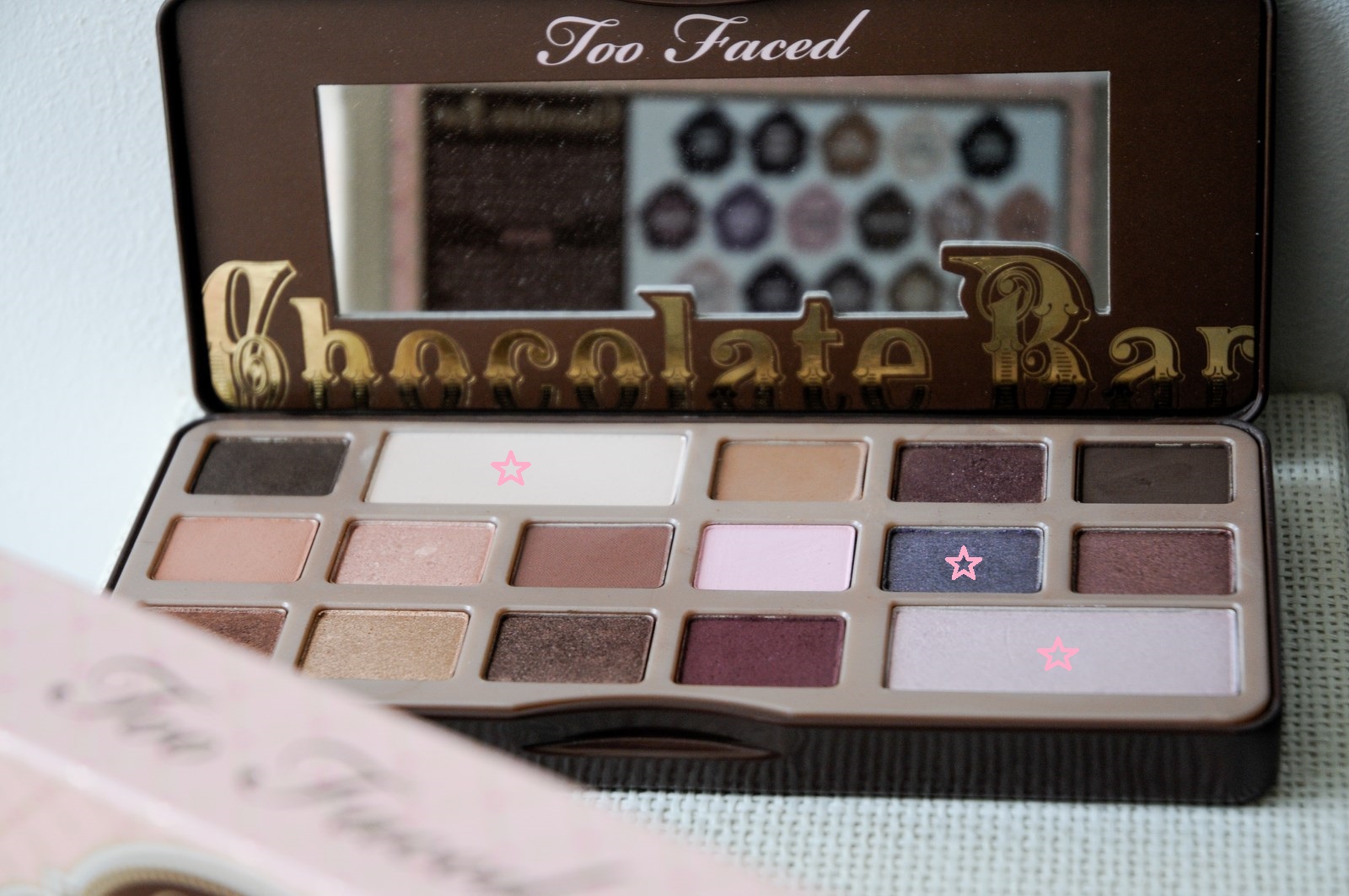 1/ Après avoir posé un primer, ici le « Sin »  Urban Decay Primer Potion, on applique sur l’ensemble de la paupière le « White Chocolate » (en haut à gauche) de la Chocolate Bar Too Faced. Ce fard servira à estomper plus facilement les fards suivants plus pigmentés et aussi comme fard de transition.