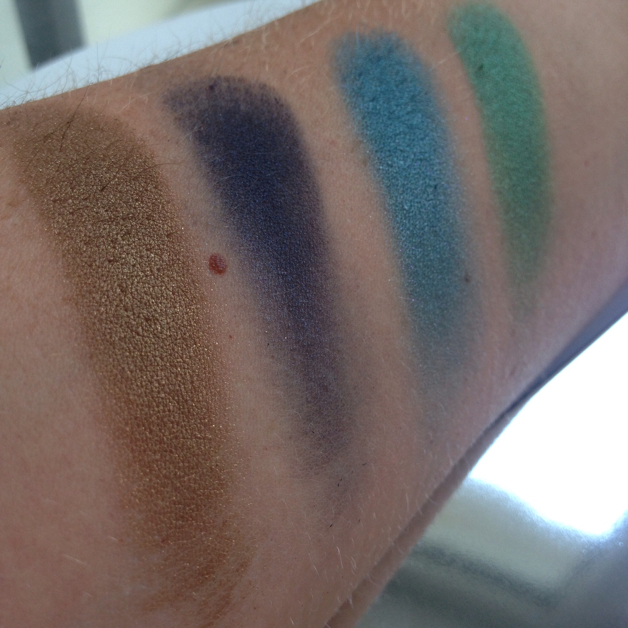 Seconde ligne: les teintes froides bleues et vertes: Brokedown (un mix de bronze, doré avec de légers sous tons verts) / Héroïne (un bleu mat profond mais qu’il faudra intensifier par plusieurs passages je pense) / Freeze et Dragon (mes deux coups de cœur de cette ligne! Des irisés superbes et denses!)