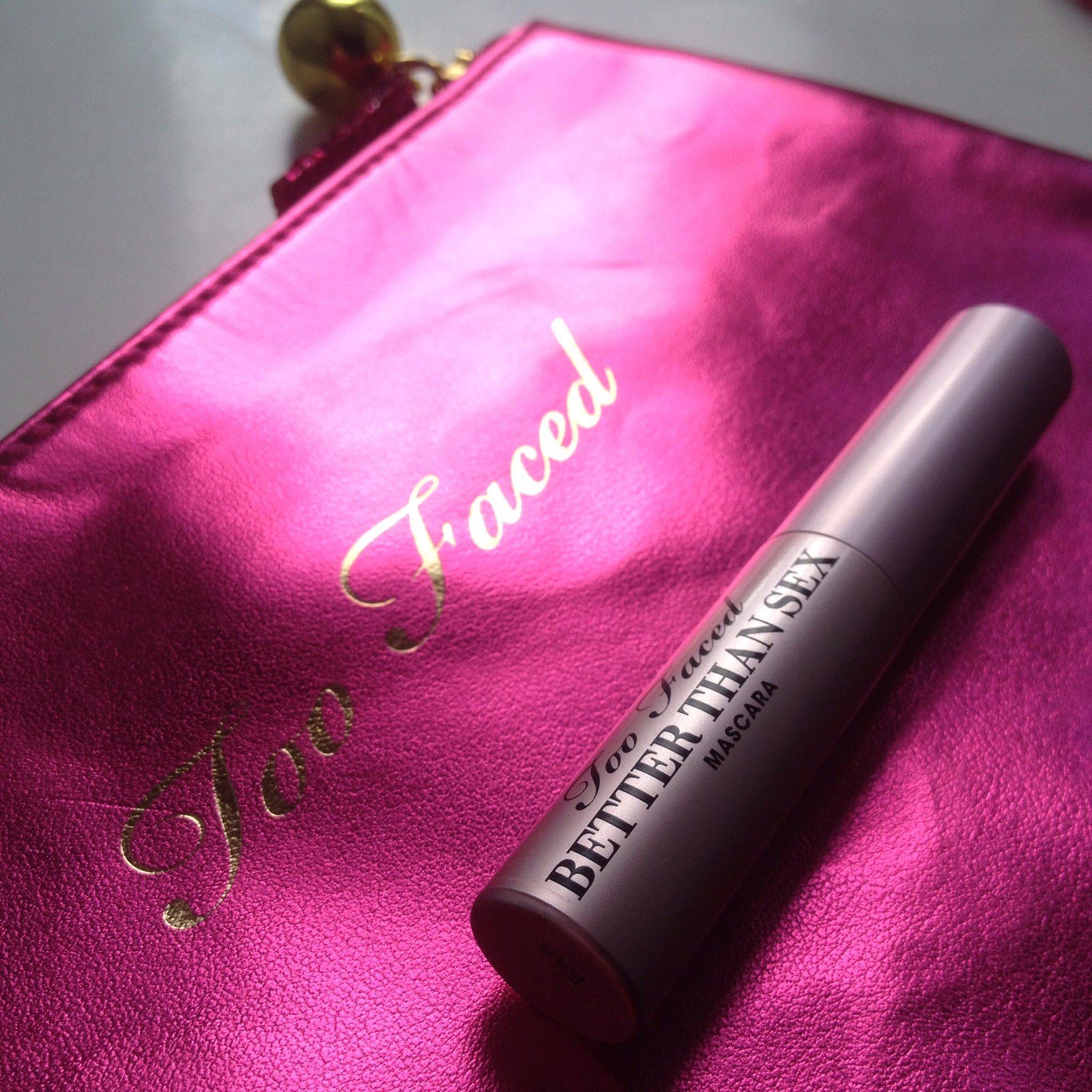 Avec une pochette trop « Too Faced » power, une face à paillettes et l’autre effet cuir estampillée de la marque, et le non pas des moindres mascara « Better Than Sex » (en taille voyage)