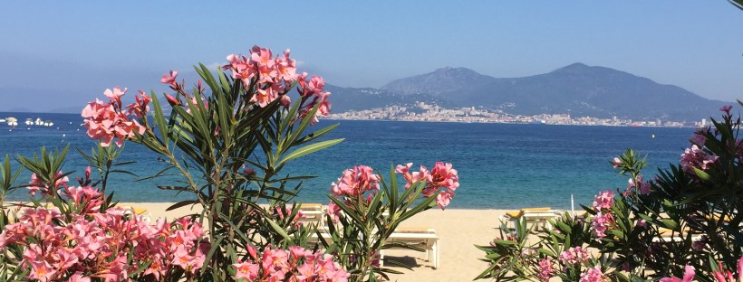 Sur la plage, avec vue sur la Baie d’Ajaccio, au milieu des lauriers roses, on se détend, on prend le temps, on profite des 1ères heures du matin, à la fraîche. Il est 9h, il fait dejà 28°…tout va bien.