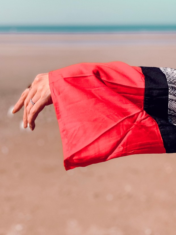 Il se boutonne sur le haut pour se porter fermé et ouvert à la fois. Les boutons sont fins et intégrés aux motifs de l’imprimé. Petit détail me direz vous? Pas pour moi, car j’ai compris rapidement l’intérêt. Mon Kimono tiendra en place tout le temps sans m’échapper des épaules et en laissant derrière moi la beauté des drapés faire leur effet.